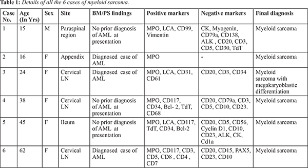 The present study at our institute included 6 cases over a period of six years. A review of case records, histopathology and immunohistochemistry was done correlating with the available bone marrow aspirates. Immunohistochemistry was done with the polymer technology method using prediluted primary antibodies from Dakoand Envision Secondary kit (Dako; Carpinteria, CA). Follow up data of the patients were retrieved. Of the six cases included in the study, the male to female ratio was 5:1. The age ranged from 15 to 62 years (median age = 33). The location of the lesion at presentation in these cases was paraspinal area, lymph node, ileum and appendix. The commonest presenting symptom was localized swelling in accordance with the site. Three cases had a prior diagnosis of AML and in the other three, a diagnosis of myeloid sarcoma lead to further investigations which did not reveal any other sites of involvement. In five of these cases, immunohistochemistry was performed for confirmation. The details of the cases are summarized in Table 1. All cases showed diffuse infiltration of mononuclear cells effacing the architecture of the underlying tissue. The cells showed scant cytoplasm, round nuclei, fine nuclear chromatin and prominent nucleoli. The IHC panel included LCA, MPO, CD68, CD117, Ki67, CD3, CD20 and TdT. All the cases were positive for MPO and two cases were positive for CD68.