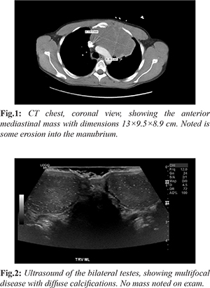 A 33 year old non-smoking man presented to the emergency department in the winter of 2020 with flu-like symptoms and hemoptysis for 1 month. He endorses fever, chills and 10 lb weight loss. He was sent into the emergency department from an urgent care for an abnormal chest x-ray after being worked up for bronchitis. He underwent CT chest, showing large anterior mediastinal mass 13×9.5×8.9 cm, extending towards the left upper lobe [Fig.1]. Mass is also shown to affect the left main pulmonary artery with bony destruction of the left side of the manubrium of the sternum with the tumor appearing to extend into the left anterior chest wall through the 1st left intercostal space anteriorly. The biopsy of the anterior mass was obtained by intervention radiology. Ultrasound showed diffusely abnormal testis, with hyper-vascularization and numerous and diffuse calcifications present throughout both testes [Fig.2]. CT of the abdomen and pelvis was negative for lymphadenopathy or metastatic disease. Tumor markers indicated lactate dehydrogenase (LDH) 1,691 (140-280 U/L), human chorionic gonadotropin (ß-HCG) 0.6 (< 15 ng/mL) and alpha-fetoprotein (AFP) 5.3 (10-20 ng/mL). Biopsy of mediastinal mass resulted in a non-seminomatous germ cell tumor, likely embryonal carcinoma. Immunohistochemical staining was positive for CD30 and PLAP. He was started on chemotherapy with bleomycin, cisplatin, and etoposide.