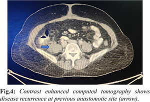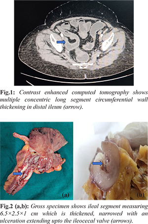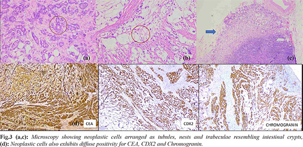 A 60-year-old female presented with a two-month history of abdominal pain, intermittent vomiting and weight loss (6 kg) in 2023. She was evaluated and found to have terminal ileitis on ultrasound. Endoscopy showed features of peptic ulcer disease. Contrast-Enhanced Computed Tomography (CECT) showed multiple concentric long segment circumferential wall thickenings in distal ileum with stricture along with mesenteric lymphadenopathy suggesting either Crohn’s disease, tuberculosis or malignancy [Fig.1]. She came to our hospital for further evaluation. Routine investigations were normal. CEA and CRP were normal. Mantoux test was negative. A colonoscopy showed terminal ileitis, colitis and proctitis. Biopsy suggested only inflammation. Repeat CECT suggested similar findings. In view of persistent symptoms, she underwent diagnostic laparoscopy with limited ileocecal resection in August 2023. She was then discharged on the seventh postoperative day. Gross specimen showed thick, narrow and ulcerated ileal segment measuring 6.5×2.5×1 cm and extending up to the ileocecal valve [Fig.2a,b]. Neoplastic cells were arranged as tubules, nests and trabeculae resembling intestinal crypts. Other areas show signet ring/goblet like mucinous cells. Four out of eighteen lymph nodes showed metastatic carcinoma. The neoplastic cells also exhibited diffuse positivity for CEA, CDX2, Synaptophysin, Chromogranin and p53 [Fig.3a,d]. PAS stain was positive highlighting the extracellular mucin. Altogether, this suggested amphicrine carcinoma of ileum with lympho-vascular and perineural invasion (pT4N2 disease). She received eight cycles of adjuvant capecitabine-oxaliplatin chemotherapy. One year follow-up showed disease recurrence at previous anastomotic site [Fig.1d]. She is currently under strict medical oncology follow-up.