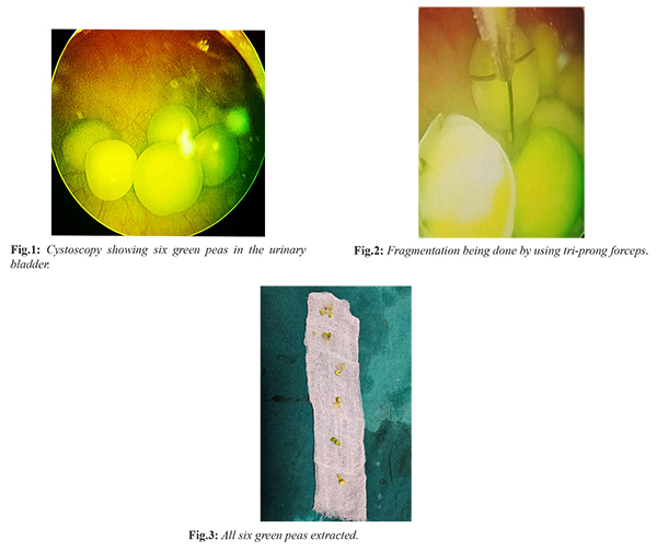 In view of acute retention of urine, per urethral catheterization with 8 French infant feeding tube was tried to relieve the retention in the emergency room to empty the bladder but the attempt was unsuccessful as the tube could not be negotiated beyond two cm from the meatus due to the impacted peas. Due to the severe intensity of pain and acute urinary retention, it was decided to subject the patient to emergency cystoscopy and retrieval of the green peas under spinal anaesthesia after initial evaluation with X-ray KUB, ultrasound (USG) abdomen pelvis and routine blood investigations. X-ray was normal, USG showed a distended bladder and routine blood investigations were normal.