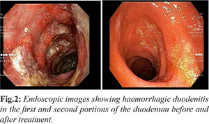 Routine blood investigations revealed anemia (hemoglobin 10 gm%), leukocytosis (total leukocyte count 12,500 cells/mm³), and a normal platelet count. Liver and kidney function tests as well as INR were within normal limits. After adequate resuscitation, upper gastrointestinal endoscopy was performed, which showed diffuse edematous, hemorrhagic, and friable mucosa with ulcerations and exudates in the first and second portions of the duodenum [Fig.2]. In view of the extensive mucosal friability, duodenal biopsy was deferred to avoid the risk of aggravating gastrointestinal hemorrhage or causing perforation. Dermatology consultation was obtained, and a biopsy was taken from a representative skin lesion. The patient was simultaneously started on pulse methylprednisolone at a dose of 1 gm/day for three days.