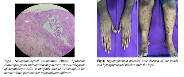 Histopathological examination of the skin lesion demonstrated suprabasal acantholysis and spongiosis with eosinophilic and neutrophilic exocytosis, presence of acantholytic cells, and perivascular inflammatory infiltrate within the dermis, findings suggestive of pemphigus vulgaris [Fig.3]. Direct immunofluorescence microscopy could not be performed as the facility was not available at our center. A repeat upper gastrointestinal endoscopy after three days of pulse steroid therapy and pantoprazole infusion showed significant improvement in the duodenal mucosal abnormalities. The patient was allowed oral intake after three days and had no further episodes of gastrointestinal bleeding. He was discharged on oral pantoprazole, prednisolone (1 mg/kg), and azathioprine 50 mg/day. Prednisolone was tapered after four weeks by 5 mg every week and subsequently discontinued, while the azathioprine dose was increased to 100 mg per day. At follow-up visits, the patient showed substantial improvement in his dermatological manifestations with complete resolution of blisters and erosions [Fig.4].