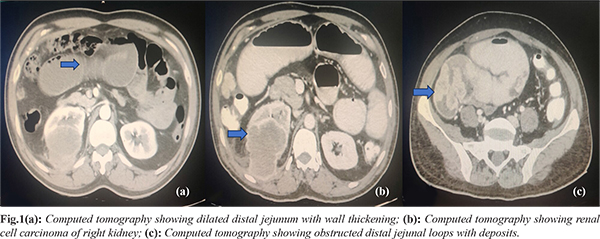 A 47-year-old male presented in 2023 with complaints of abdominal pain, vomiting, and constipation for seven days. He had a known history of clear cell type renal cell carcinoma (RCC) diagnosed in 2021 with metastases to the bone and right lung. At the time of diagnosis, he received palliative radiotherapy (30 Gy) to the thoracic vertebrae for bone metastasis. Subsequently, he was started on systemic therapy with pazopanib and axitinib. In September 2023, due to disease progression, a contrast-enhanced computed tomography (CECT) scan of the abdomen was performed. Imaging revealed an exophytic hypodense lesion measuring 5×4.9×5 cm in the upper pole of the right kidney along with dilatation and wall thickening of the distal jejunum and a few scattered omental deposits [Fig.1a]. At that time, the patient was receiving axitinib and denosumab. General physical examination was unremarkable. Abdominal examination revealed a distended abdomen with tenderness in the lower abdomen. An abdominal X-ray suggested sub-acute intestinal obstruction, and the patient was initially managed conservatively. However, due to persistent symptoms, a repeat CECT abdomen was performed, which showed similar findings along with newly identified mesenteric and jejunal deposits causing acute obstruction involving the distal jejunum [Fig.1b-c].