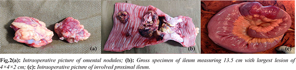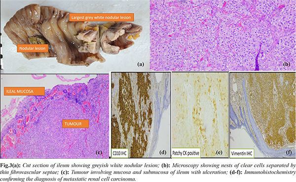 The patient subsequently underwent diagnostic laparoscopy with resection and anastomosis of the obstructed proximal ileal segment along with excision of omental deposits in October 2023. Intraoperatively, a large tumor measuring approximately 6×5 cm was identified involving the proximal ileum, causing near-complete obstruction. Gross examination of the resected ileal specimen measured 13.5 cm in length, and the mucosal surface showed three nodular lesions, the largest measuring 4×4×2 cm [Fig.2a-c]. On cut section, the lesion appeared grey-white and extended into the subserosa [Fig.3a]. Microscopic examination revealed an ulcerated neoplasm arranged in compact nests and sheets of tumor cells with intervening thin-walled vasculature. The tumor nests were separated by fibrous septae with associated lymphoplasmacytic infiltrate [Fig.3b-c]. Immunohistochemical analysis was consistent with metastatic RCC [Fig.3d-f]. The postoperative period was uneventful, and the patient was discharged in a stable condition. Following surgery, he continued systemic therapy with axitinib and adjuvant pembrolizumab for RCC. Follow-up CECT abdomen performed in March 2024 demonstrated further disease progression, and the patient is currently under ongoing management by the medical oncology team.