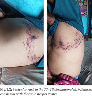 A 65-year-old male with a past medical history of well-controlled hypertension and hyperlipidemia presented to the outpatient department of a tertiary care center with complaints of burning pain and tingling sensations over the right flank for several days. Within 48 hours, the pain radiated anteriorly across the chest wall and was followed by the appearance of a vesicular rash in a dermatomal distribution corresponding to T7-T8, consistent with a clinical diagnosis of thoracic herpes zoster [Fig.1,2]. At the time of presentation, there were no associated motor or sensory deficits, and the patient denied fever, bowel or bladder dysfunction, or constitutional symptoms.