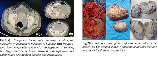 and calcifications, measuring 19×15 cm and 10×15 cm, abutting adjacent structures [Fig.1b]. In view of poor chemoresponsiveness, exploratory laparotomy with wide excision of the recurrent tumor was performed. Intraoperatively, the tumors were adherent to the bladder dome and peritoneum [Fig.2a]. Gross examination revealed two large solid masses with solid-cystic cut surfaces containing mucinous material [Fig.2b].