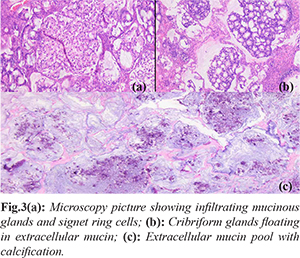 Microscopic evaluation showed an infiltrating neoplasm composed of tubular and cribriform glands along with signet-ring cells floating in abundant extracellular mucin. The tumor cells exhibited mild to moderate nuclear atypia [Fig.3a-c]. The postoperative period was uneventful, and the patient is currently on follow-up with medical oncology for further management.