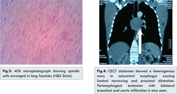 52 years old gentleman was admitted with complain of dysphagia for 3 months. Clinical examination was normal. Biochemical and hematological parameters were within normal limits. Upper gastrointestinal endoscopy showed a smooth narrowing in esophagus from 28-34 cms. CECT abdomen showed a large heterogenous mass in the subcarinal esophagus causing luminal narrowing and proximal dilatation along with periesophageal extension with bilateral bronchial and aortic infiltration [Fig.4]. CT guided percutaneous biopsy showed features of malignant spindle cell tumor. Mitotic activity of 4/10 Hpf was also noticed. Immunohistochemistry showed strong positivity for SMA and desmin with negative CD 34 and CD 117 suggestive of leiomyosarcoma. Since the tumor was unresectable, covered self-expandable metal stent (SEMS-Nitinol-S) was placed to palliate dysphagia and radiotherapy(45 Grays) given. Now patient tolerating semisolid food without difficulty and he is in regular follow up.