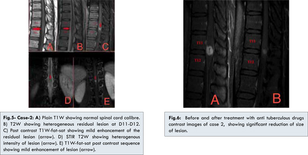 A 31-year-old female was admitted with complaints of intermittent back pain for 1 year, weakness and numbness in left lower limb for 3 weeks. There was no history of trauma or fever. Physical examination revealed mild muscle atrophy, hyporeflexia of the patellar tendon, and decreased sense of joint position in left lower limb. Limping gait was noted in left lower limb. Clinically there were no signs and symptoms suggestive of tuberculosis. Laboratory results including complete hemogram were within normal limits. Chest X-ray and ultrasound abdomen revealed no abnormality. Magnetic Resonance Imaging (MRI) of thoracic spine [Fig.1] showed well defined focal intramedullary oval lesion of size 2.3 (cranio-caudal)x1.0 (anterio-posterior)x1.0 (transverse) cm, involving the thoracic cord at T9 – T10 vertebral level with focal cord expansion at this level. Lesion was isointense to cord on T1-weighted image and hyperintense with central hypointensity on T2-weighted image. On T2-weighted image there was an ill-defined hyperintense signal within the cord extending superiorly upto T2 vertebral level and inferiorly upto conus suggestive of cord oedema. After gadopentetate dimeglumine administration, homogenous moderate enhancement was observed in the lesion on T1-weighted post contrast study. No meningeal enhancement, epidural collections or other focal lesions were seen. The vertebrae exhibited normal marrow signal intensity. With the above imaging characteristics of intramedullary lesion, differential diagnosis of tuberculous granuloma, ependymoma and glioma were suggested. Patient underwent laminectomy with open biopsy. Pathological examination showed multiple epitheloid granulomas with langerhans type giant cells, surrounded by lymphocytes and plasma cells suggesting granulomatous inflammation. Hence patient was started on anti tuberculous therapy. Patient was clinically relieved from back pain with normal power and sensation in left lower limb during the course of antituberculous therapy. Follow up MRI of thoracic spine [Fig.2] done after 4 months showed small residual focal intramedullary lesion at T9-T10 vertebral level, measuring 1.5 (cranio-caudal)x0.7 (anterio-posterior)x0.7 (transverse) cm. Post contrast images showed mild heterogenous enhancement of the lesion [Fig.3]. No other focal lesions or meningeal enhancement were seen.