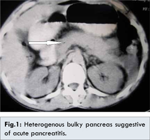 Ultrasonography (USG) abdomen revealed mild hepato-splenomegaly with mild ascites. A notable finding was the presence of edematous, heterogenous appearing head and body of pancreas with strong possibility of acute pancreatitis. No gallstones or biliary tract abnormalities were noted on USG. Contrast enhanced Computed Tomography (CECT) abdomen showed presence of severe acute pancreatitis [Fig.1]. Chest X-ray showed bilateral trace pleural effusion. Pleural fluid study was transudative in nature. Urine culture, stool routine and culture showed no growth. However, blood culture grew Salmonella typhi which was sensitive to third generation cephalosporins. A final diagnosis of enteric fever complicated by acute pancreatitis with evidence of acute hepatitis, prerenal failure and type 1 respiratory failure was made. The patient was started on adequate intravenous fluids, ceftriaxone (based on the culture-sensitivity pattern). The patient’s general condition improved and he was discharged in a stable condition on 17th day of admission.