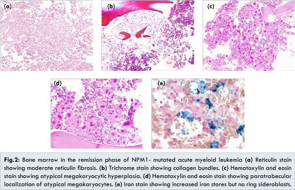 Nucleophosmin (NPM1) mutation is a frequent finding in acute myeloid leukemia (AML), occurring in 60% of adult cases with a normal karyotype [1]. Normally, NPM1 is located in the nucleus of myeloid cells, but NPM mutants are aberrantly localized to the cytoplasm of leukemic blasts, due to frameshift mutations involving one allele of the NPM1 gene [1,2,3]. NPM1-mutated AML is associated with unique gene expression profile and microRNA (miRNA) signatures [3]. A paradoxical phenomenon in NPM1-mutated AML is an increased number of megakaryocytes in the bone marrow associated with thrombocytopenia. A mouse model with NPM1 mutation also showed increased megakaryocytes with thrombocytopenia, but no evidence of leukemia [3]. A similar phenomenon was observed in human cases of NPM1 mutated AML [3]. Flow cytometric immunophenotypic analysis of the mouse model suggested that NPM1 mutant blocks megakaryocyte differentiation rather than causing an increase in the number of megakaryocytes secondary to platelet destruction [3]. However, no atypical megakaryocytic hyperplasia with myelofibrosis has been reported in NPM1-mutated AML. We herein report a case of NPM1-mutated AML with features mimicking primary myelofibrosis emerging in the remission period.