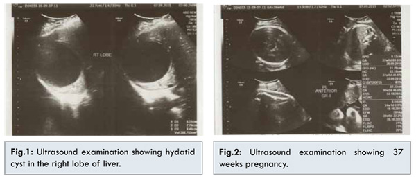 The patient was a primigravida 25 years old, resident of northern India. This was a spontaneous pregnancy. The first trimester of pregnancy was uneventful and all routine investigations were normal. The patient had taken folic acid, iron and calcium. At 24 weeks gestation, the patient had pain on right upper abdomen which subsided after 4-5 hours. She experienced a similar attack of pain 10 days after. On examination vitals were stable. However, ultrasound  abdomen revealed an exophytic cyst in the right lobe of liver (8 cm) with no calcification and a single live fetus with growth corresponding to 25 weeks of pregnancy. A provisional diagnosis of hydatid cyst was made which was supported by a positive anti-echinococcal antibody testing by ELISA (IgG). An opinion from the surgeon was sought. A conservative approach to the hydatid cyst was decided because of the fear of preterm labour and the risk of severe anaphylaxis during pregnancy. The patient was put on albendazole in a dose of 400 mg once a day. Serial liver functions tests were done which were normal. The patient was monitored regularly.