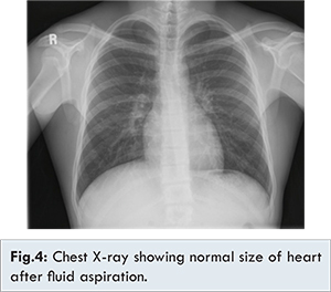 After the fluid aspiration the patient symptoms improved, dyspnoea was reduced. A repeat X-ray had showed the size of the heart had decreased [Fig.4]. The patient was then started with thyroxine 200 µg/day. The patient came for follow up at the end of 1 month and the patient was totally free of symptoms and she is doing well.