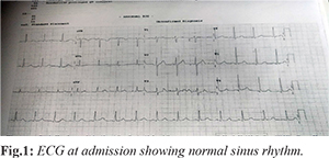 Biochemical investigations did not reveal any abnormalities. In view of intermittency of the complaints patient was kept under observation in ED on a monitored bed. Four hours later, patient had an episode of profuse sweating and disorientation. A repeat of his baseline vital signs revealed hypotension (80/50 mmHg), feeble radial pulse, and a blood sugar level of 112 mg/dL. Repeat ECG was suggestive of  inferior wall myocardial infarction with ST elevation in lead II, III , AVF and depression in I, AVL, V1, V2, V3 [Fig.2].