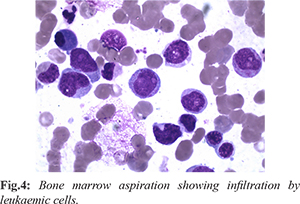 He was given packed cell transfusions along with intravenous deflazacort following which he showed symptomatic improvement. He was also started on tumor lysis prophylaxis (allopurinol 100 mg thrice daily), antiviral (acyclovir 200 mg four times daily), antifungal (fluconazole 150 mg once daily) and antibiotics (double strength cotrimoxazole twice daily). He was advised induction therapy with cytarabine/ daunorubin, but patient and his attendants wanted to try ayurvedic medications and hence was lost for follow-up.