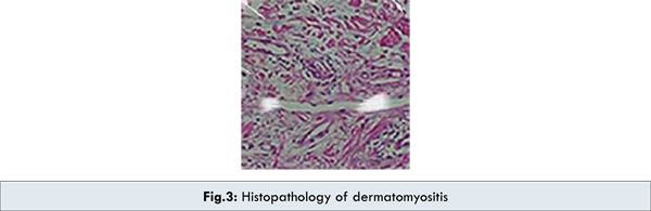 Systemic corticosteroids are the main stay of therapy and are the first line treatment in patients with dermatomyositis [7]. The earlier the therapy with corticosteroids, the better is the overall prognosis. Our patient responded to steroids therapy (prednisolone 60 mg once daily). Hydroxychloroquine sulfate, and antimalarials can also be used to treat dermatomyositis [8]. Rarely, antimalarials can contribute to muscle weakness by causing a vacuolar myopathy.