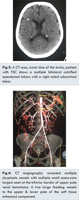 Preliminary blood and urine tests revealed, normocytic–normochromic anemia, borderline renal function with no pyuria or hematuria. Soon after resuscitation with 2 units packed red blood cells and 4 units of plasma expanders, patient was stable and transferred for radiological assessment. Ultrasonography and CT scan revealed massive retroperitoneal hemorrhage; bilateral, multiple angiomyolipoma; right lower pole heterogeneous mass suggestive of RCC; left hydronephrosis [Fig.1,2] and intracranial calcifications (cerebral - subepindymal) [Fig.3]. CT – angiography showed three right side aneurismal dilatations (bleeding sites) which confirm the diagnosis and management plan was formalized [Fig.4,5].